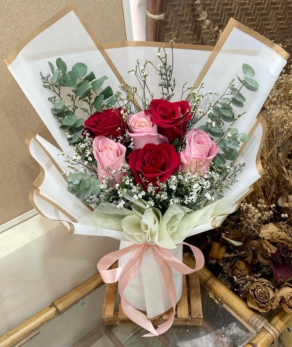 Buquet de 3 rosas rojas y 3 rosas rosadas, peniculata blanca, eucalipto verde.
