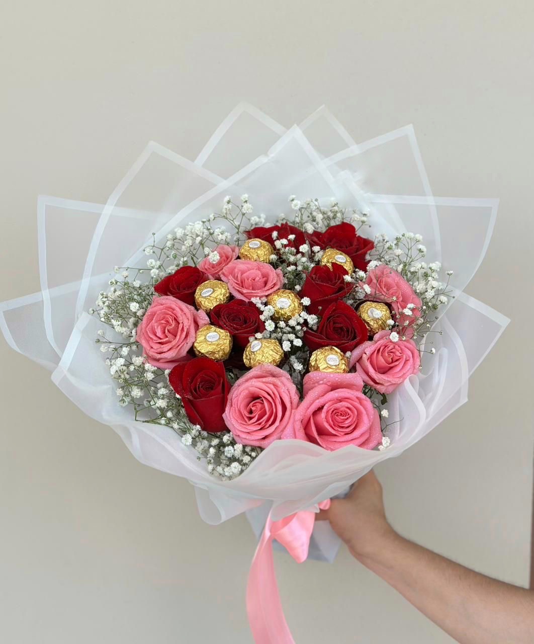 Buquet de 7 rosas rojas, 7 rosas rosadas, peniculata blanca, y 8 bombones Ferrero Rocher.