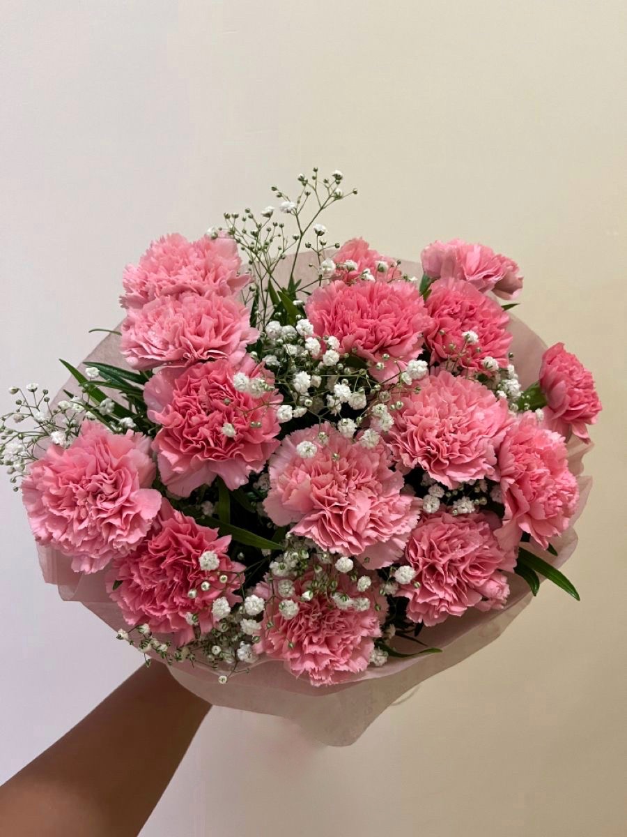 Buquet 10 rosas rojas, eucalipto verde y peniculata blanca. Disponible también en rosado.