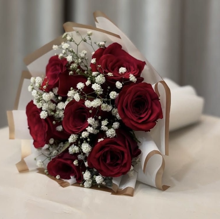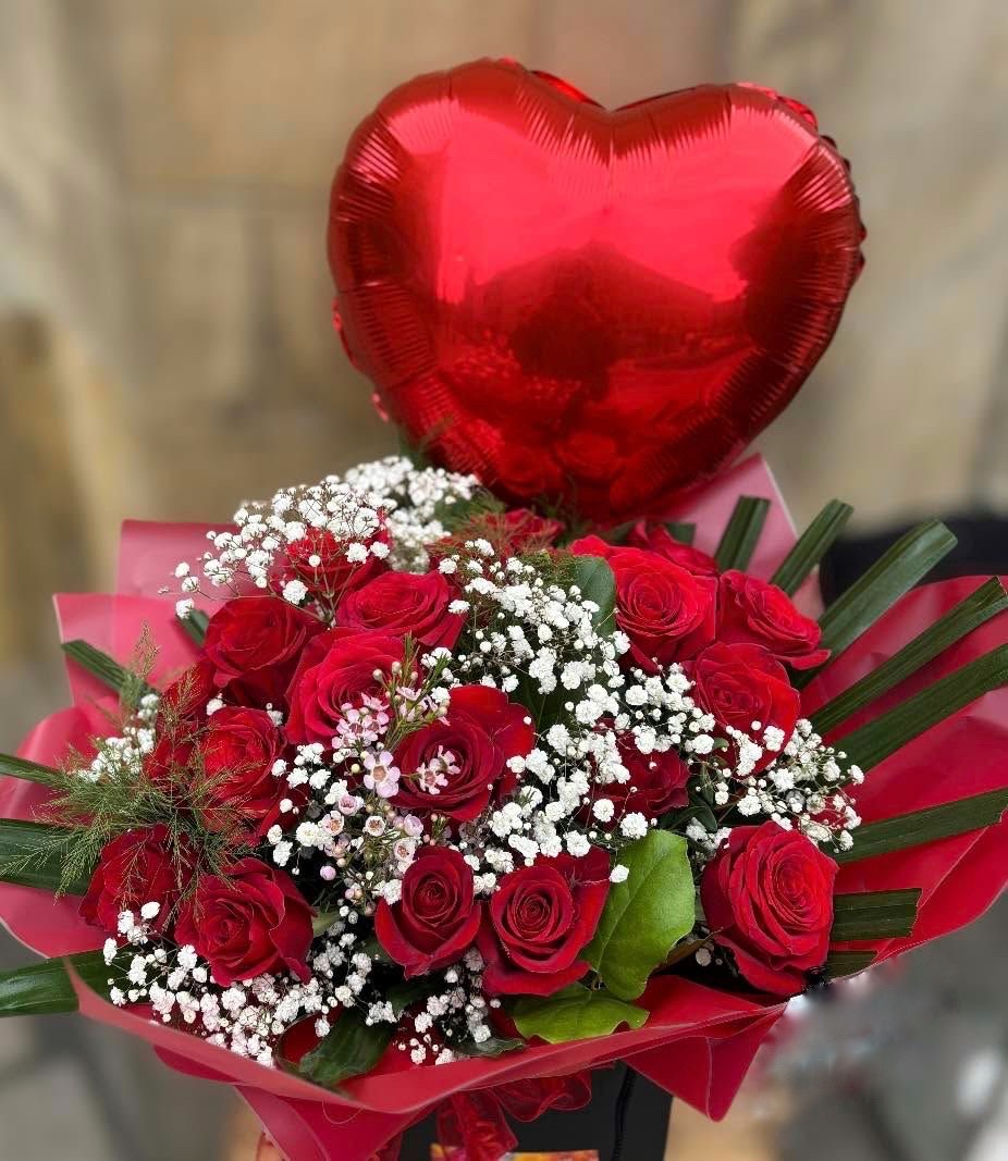 Buquet 10 rosas rojas, eucalipto verde y peniculata blanca. Disponible también en rosado.