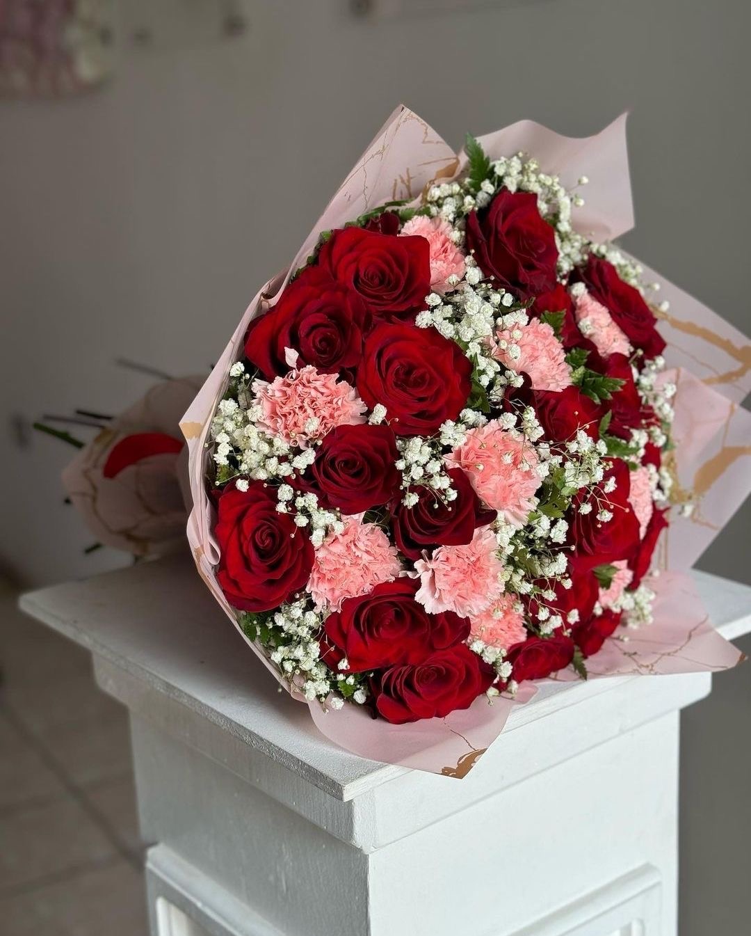 Buquet de 3 rosas rojas y 3 rosas rosadas, peniculata blanca, eucalipto verde.